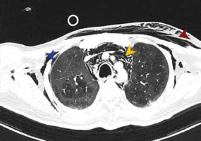 We observed 38 barotrauma events in the 30 patients (Figure 1). The most common event was PTX (Figure 2), seen in 26 out of 30 patients (86.6%). Nearly one-third of the patients had SCE (9/30), while seven patients had multiple events (Figure 3), including two patients who had a combination of PTX, PM and SCE (Figure 4). Intercostal drains (ICDs) were inserted in 24 of the 30 patients (80%), while the rest were managed conservatively. Two-thirds of patients (20/30) in this group developed barotrauma while on IMV (Table 3). The mean FiO2 at the time of the barotrauma event was 66.9% ± 19%. Preexisting conditions affecting the respiratory system were seen in over a third (11/30) of the barotrauma patients, which was statistically comparable to the non-barotrauma group (5/30, P = 0.80). These conditions included bronchial asthma, chronic obstructive pulmonary disease, interstitial lung disease, post-surgical pleural injury, lung malignancy and tuberculosis. The median onset of barotrauma was 9 (IQR 4–13.5) days after ICU admission.