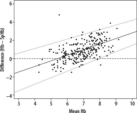 A total of 266 paired measurements of Hb and SpHb measurements were available in 75 patients (2–6 per patient). The mean invasive Hb was 7.44 ± 1.33 mmol L–1 and the mean SpHb was 6.47 ± 0.8 mmol L–1 (P < 0.001). BlandAltman analysis with correction for repeated measurements (Figure 2) revealed a proportional bias with a slope of 0.78 (bias= –4.05 + 0.78 × average Hb). At an average Hb of 5.6 the bias was the smallest. At higher and lower Hb the bias became higher. The lower and upper LOA had the same patterns (bias –1.96 SD = –5.53 +0.68 Hb; bias +1.96 SD = –2.53 + 0.76 Hb).