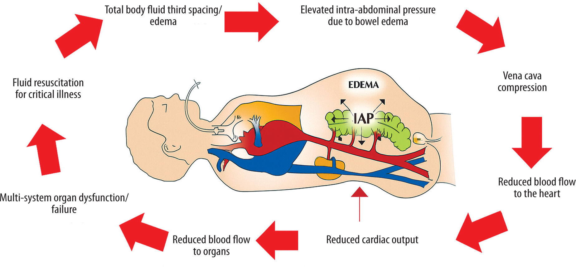 Vicious cycle illustrating how ongoing intravenous fluid resuscitation can cause iatrogenic secondary intra-abdominal hyper-tension and multiple organ failure. Adapted with permission from Malbrain MLNG et al. according to the Open Access CC BY Licence 4.0 [23]