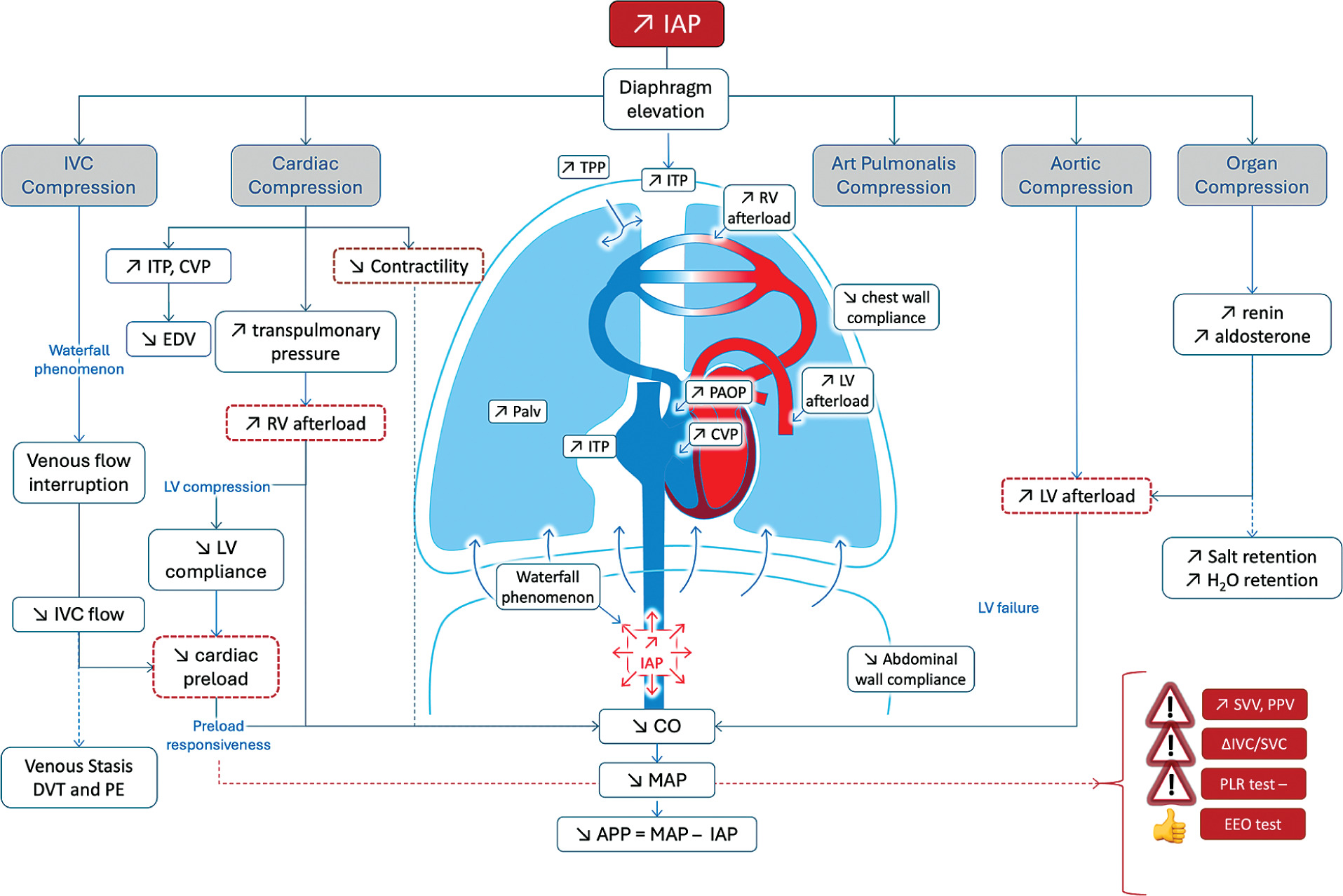 IAH can significantly impair cardiac contractility due to the elevation of the diaphragm and the rise in ITP, both of which exert direct compressive forces on the heart (Figure 1). This compression also affects the pulmonary parenchyma, leading to increased pulmonary artery pressure (PAP) and elevated PVR, while simultaneously reducing LV preload.