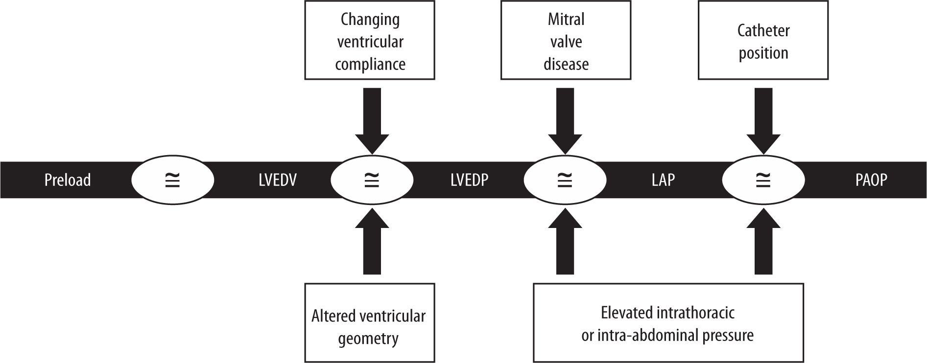 According to the Frank-Starling principle, ventricular preload is defined as the length of myocar-dial muscle fibres at end-diastole (Figure 3) [23]. In clinical practice, the ideal surrogate for this would be the LV end-diastolic volume (LVEDV); however, this parameter is difficult to measure reliably and repeatedly at the bedside [53, 66]. Assuming that ventricular compliance remains unchanged, variations in ventricular volume would theoretically correspond to changes in ventricular pressure through the following relationships: