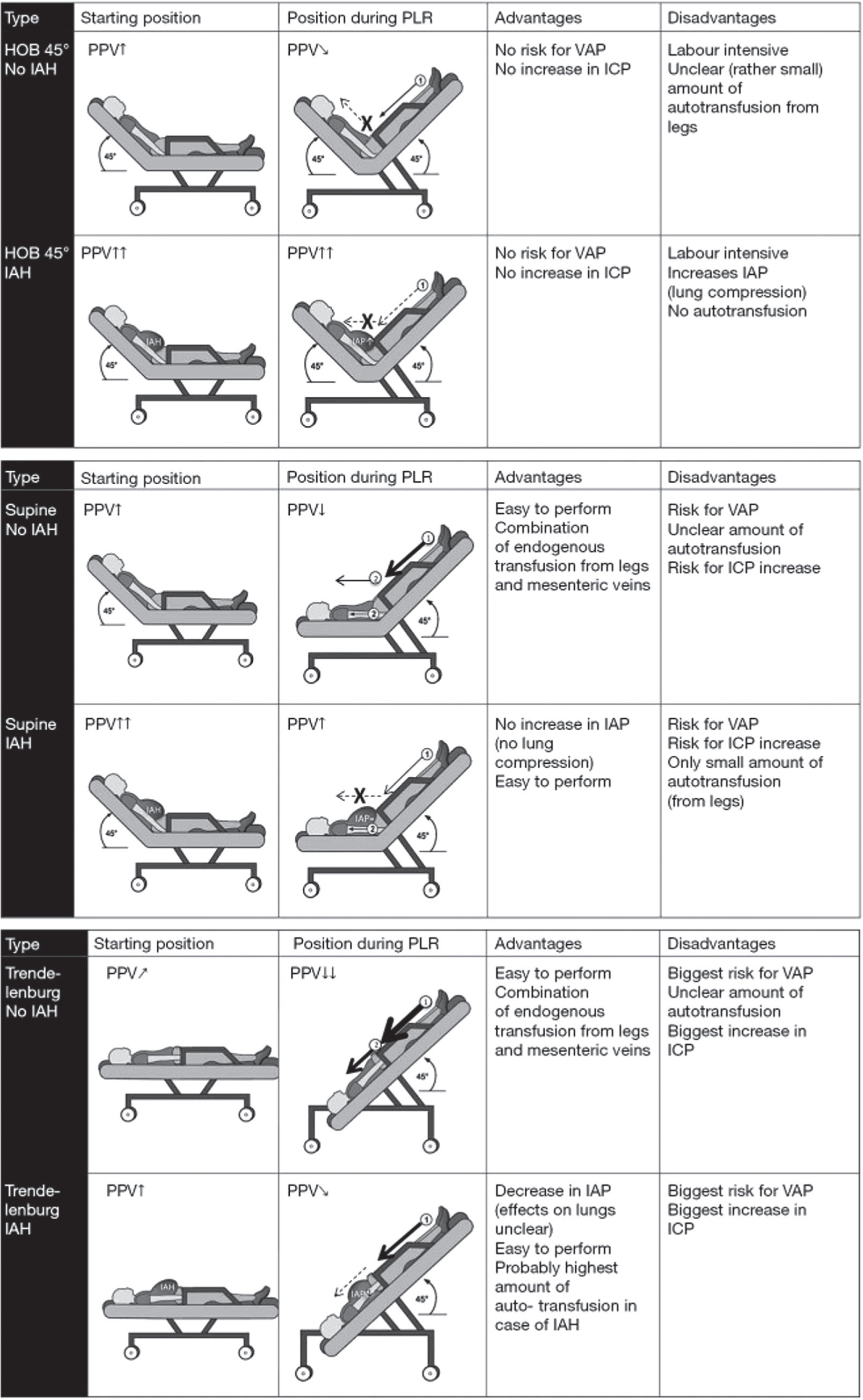 Effects of different passive leg raising tests. Schematic overview comparing the possible effects and (dis)advantages of PLR test in (A) HOB 45°, (B) supine, (C) Trendelenburg during normal IAP and IAH. Schematic overview comparing the possible effects and (dis)advantages of different passive leg raising (PLR) tests during normal IAP and IAH. The PLR can be performed from HOB (A) or supine (B) position or putting the patient in the Trendelenburg position (C). Endogenous fluid resuscitation comes from venous return from the legs and the mesenteric veins. The amount of the endogenous fluid resuscitation is indicated by the thickness of the arrow. Adapted from Minini et al. with permission [106]. A dotted line marked with “X” indicates the absence of endogenous trans-fusion from that region. PPV – pulse pressure variation, ICP – intracranial pressure, VAP – ventilator-associated pneumonia, IAP – intra-abdominal pressure, IAH – intra-abdominal hypertension, HOB – head of bed
