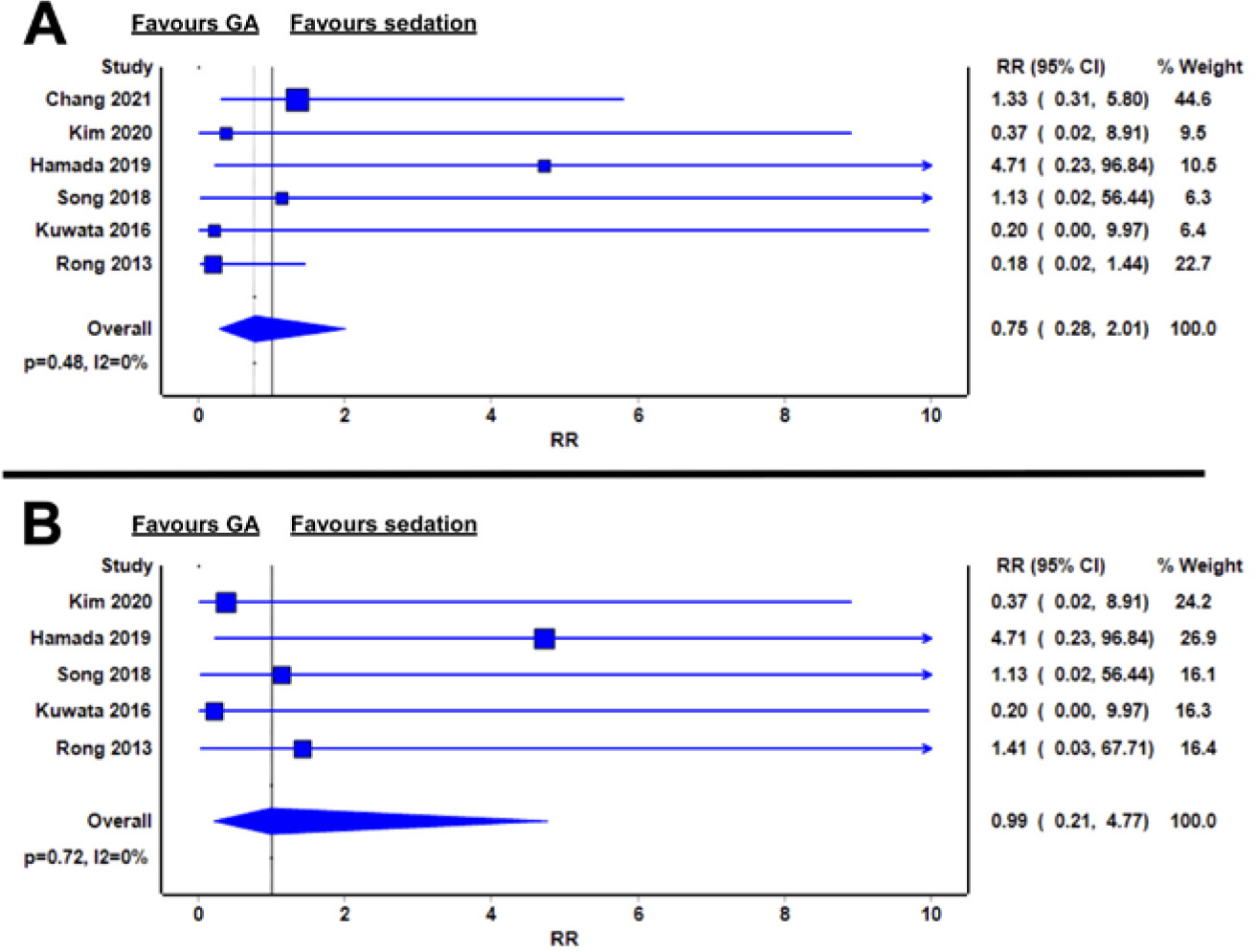 In oesophageal ESD, the relative risk of bleeding was similar between GA and sedation (RR 0.99; 95% CI: 0.21–4.77; I2 = 0%; P = 0.72) (Figure 5B).