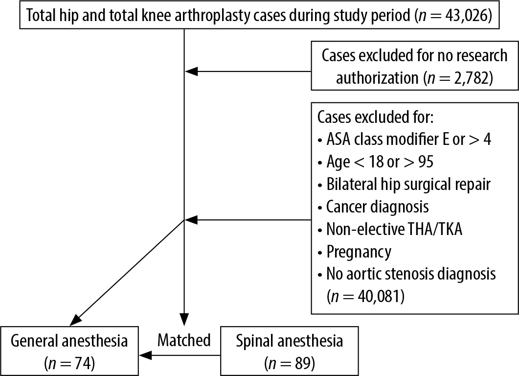 After receiving institutional review board approval, a retrospective chart review was conducted of patients with AS who underwent elective primary TJA between January 1, 2011, and November 30, 2017, at three hospitals within one health system. These patients were identified through International Classification of Disease (ICD)-9/10 codes to identify AS as a medical comorbidity prior to TJA, which was identified by Current Procedural Terminology (CPT) codes for total knee arthroplasty (TKA) and total hip arthroplasty (THA). We then identified all patients with pre-operative AS undergoing TJA. Subsequently, we identified those who received SA using pharmacy data to identify intrathecal local anesthetic administration. We compared outcomes from this group to a matched cohort of patients with AS undergoing TJA receiving GA.