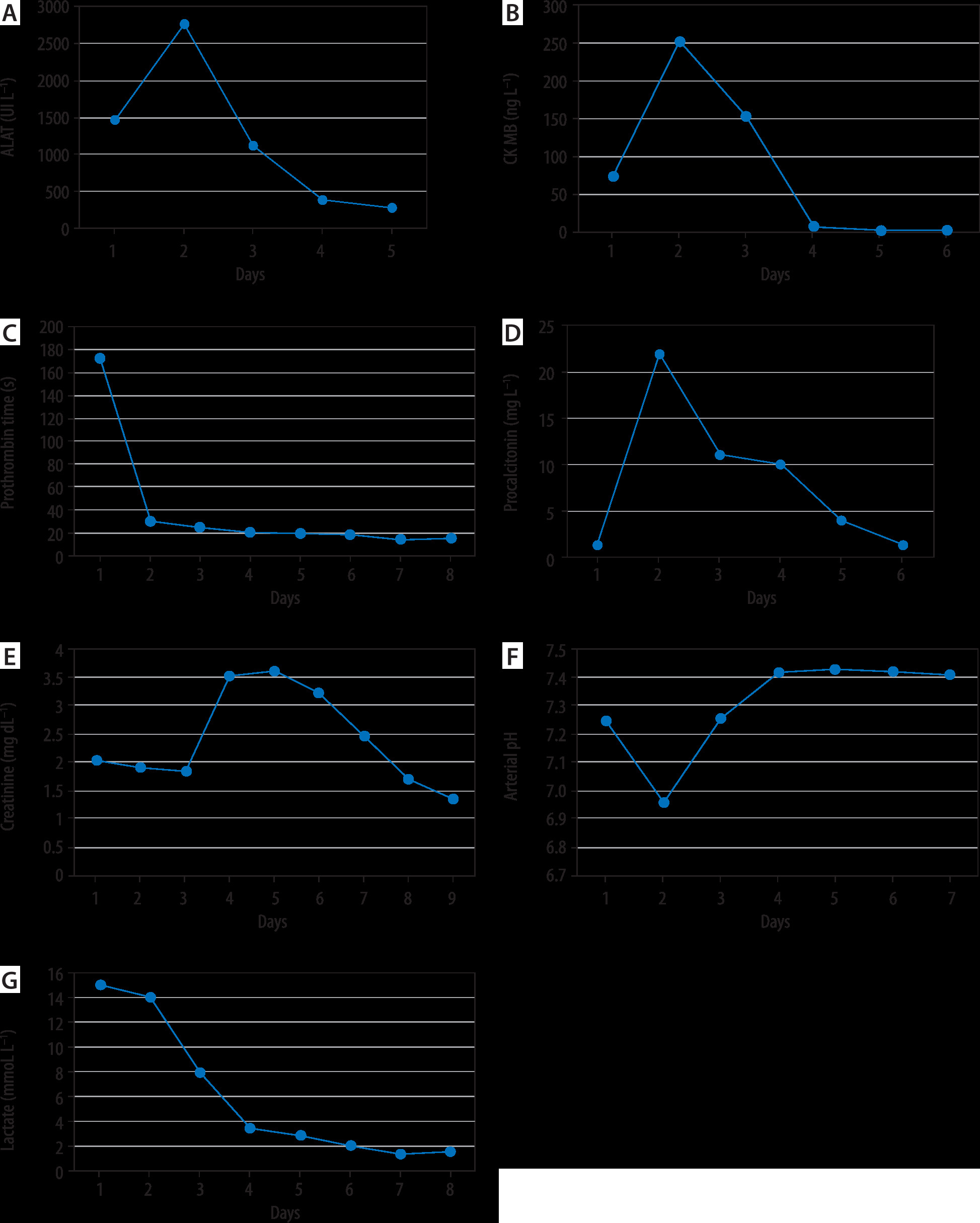 As a result of respiratory decompensation, the patient was intubated and assisted mechanical ventilation with analgosedation was commenced. Moreover, due to symptoms of acute leg ischemia, the patient was transferred to the operating room where the dysfunctional reperfusion cannula was removed, and a 6-Fr cannula into the left popliteal artery was introduced and connected to the ECMO 17-Fr arterial cannula. Limb blood supply returned to normal. After surgery, the patient developed severe metabolic acidosis, with acute kidney injury and acute liver failure. Continuous renal replacement therapy (CRRT) with heparin anticoagulation was introduced. Prismaflex (Gambro, Sweden) was integrated into the ECMO circuit.