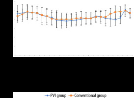 Similarly, the perioperative heart rate values showed nonsignificant differences between both groups in all time points of measurements (Figure 3). However, there was a statistically significant decrease in intraoperative values in each group compared to the preoperative baseline values at all time points except at 0 and 4 minutes post-anaesthesia induction, 0 and 2 minutes post-prone position, the 135th minute and 2 hours postoperatively in the PVI group and at 0 minutes post-anaesthesia induction, 2, 4 and 6 minutes post-prone position, and the 135th, 150th, 165th, and 180th minutes in the conventional group.