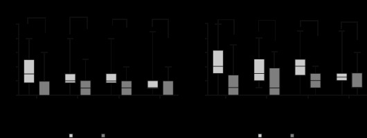 Similar results were observed concerning pain under stress (physical movement) (24 hours after surgery): median pain intensity was 1 (1 to 3) in the PECS I/II group vs. 2.5 (2 to 3) in the control group (P = 0.048). Overall, patients in the PECS I/II group had significantly lower pain levels than the control group from admission to the PACU until the first 24 hours postoperatively (Figure 2).