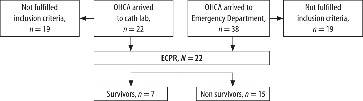 During the analysed period, 60 patients undergoing resuscitation due to OHCA were admitted to the University Hospital (38 to the Emergency Department, 22 to the Catheterization Laboratory). Among them, 22 patients met the inclusion criteria and did not meet the exclusion criteria for ECPR. The patients’ flow chart is presented in Figure 1.