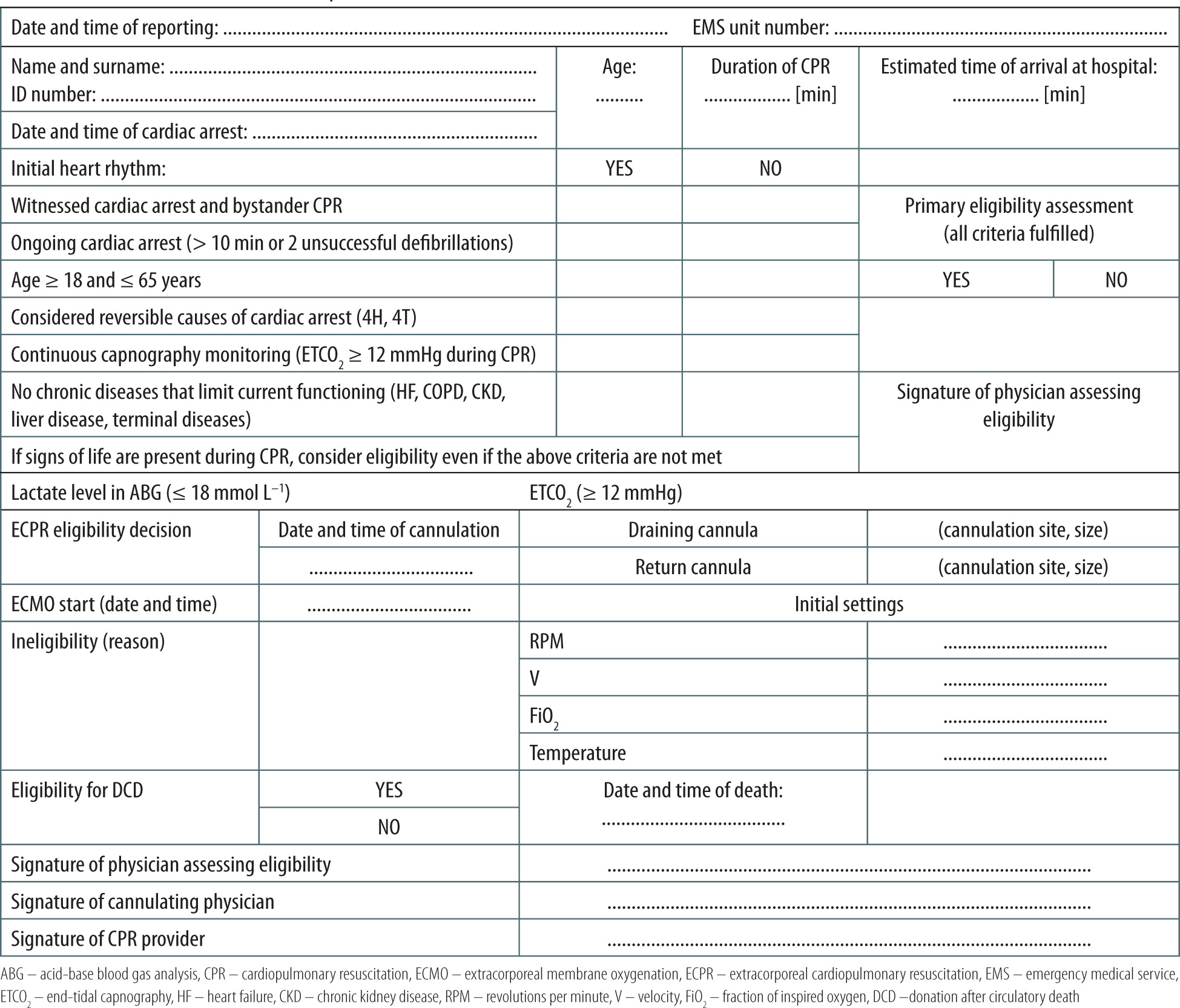 Despite significant advancements in emergency medicine in recent years, mortality rates from cardiac arrest (CA) still remain unacceptably high. According to the European Resuscitation Council registry, survival rates after out-of-hospital cardiac arrest (OHCA) reach an average of 8% at discharge from hospital [1]. Accurate identification of patients with reversible causes of circulatory arrest and implementation of appropriate therapies to improve outcomes continue to present significant challenges for medical teams [2]. Importantly, a substantial proportion of patients fail to regain spontaneous circulation despite advanced life support. These individuals may benefit from the addition of extracorporeal membrane oxygenation (ECMO) to standard advanced life support. Studies have shown that, in carefully selected patient populations, extra-corporeal cardiopulmonary resuscitation (ECPR), compared to conventional cardiopulmonary resuscitation (CPR), leads to improved restoration of systemic perfusion and oxygenation and reduces tissue hypoperfusion, ultimately increasing the likelihood of return of spontaneous circulation and reducing the risk of poor prognosis [3, 4]. Although ECPR is emerging as an attractive method of advanced care for patients with refractory CA, its implementation remains limited to a few centres in Poland, primarily those with cardiothoracic surgery capabilities.