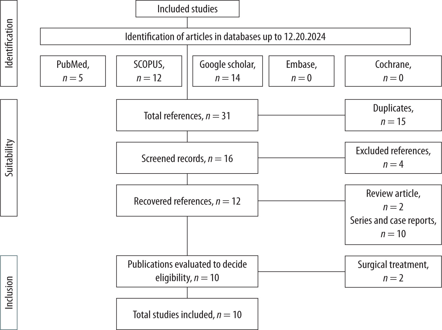 The review was carried out in several stages. In the first stage, two independent collaborators made the selection to avoid selection bias during the search for all studies, according to titles and abstracts matching our keywords and full texts. Adult patients were included without limitations on language, year of study, or publication. All studies in pregnant patients or the pediatric population were excluded. The identification of studies and literature reviews was done through a bibliographic search in the databases PubMed, Scopus, Embase, Google Scholar, and SpringerLink, in addition to a manual search of identified articles that were considered valid.