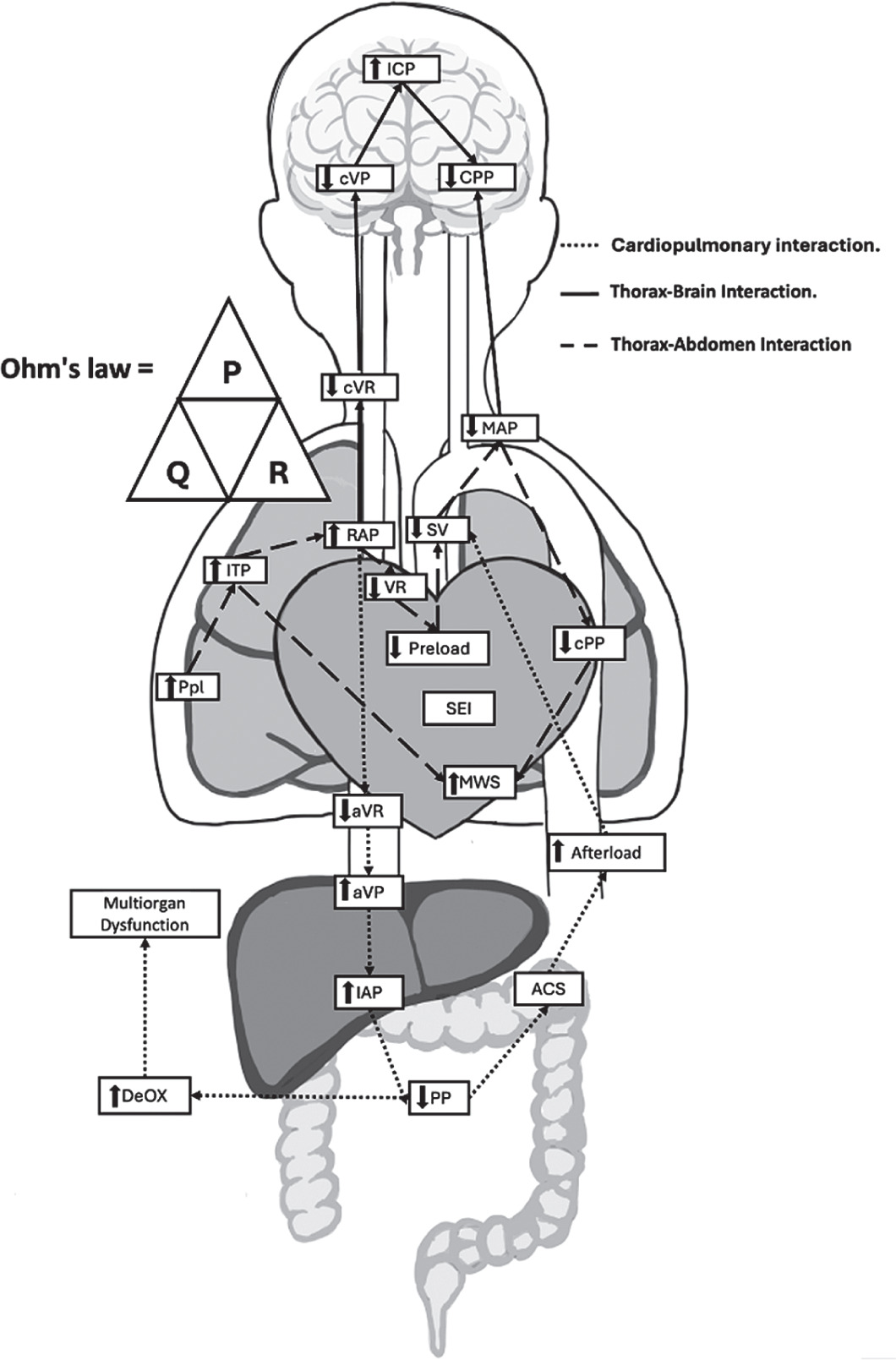 Ppl – pleural pressure, ITP – intrathoracic pressure, RAP – right atrial pressure, VR – venous return, SV – stroke volume, MAP – mean arterial pressure, CPP – coronary perfusion pressure, MWS – myocardial wall stress, SEI – subendocardial ischemia, CVR – cerebral venous return, CVP – cerebral venous pressure, ICP – intracranial pressure, CPPc – cerebral perfusion pressure, AVR – abdominal venous return, AVP – abdominal venous pressure, IAP – intra-abdominal pressure, PP – perfusion pressure, ACS – abdominal compartment syndrome, DeOX – oxygen debt