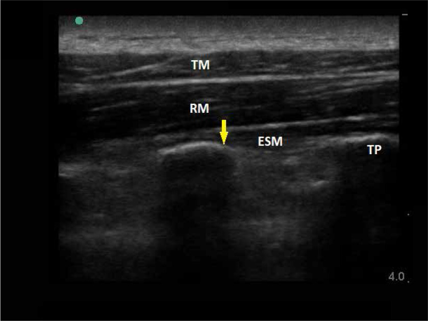 Sonoanatomy of the erector spinae plane block. TM – tra- pezius muscle, rhomboid muscle, TP – transverse process. Yellow arrow indicates site of LA deposition