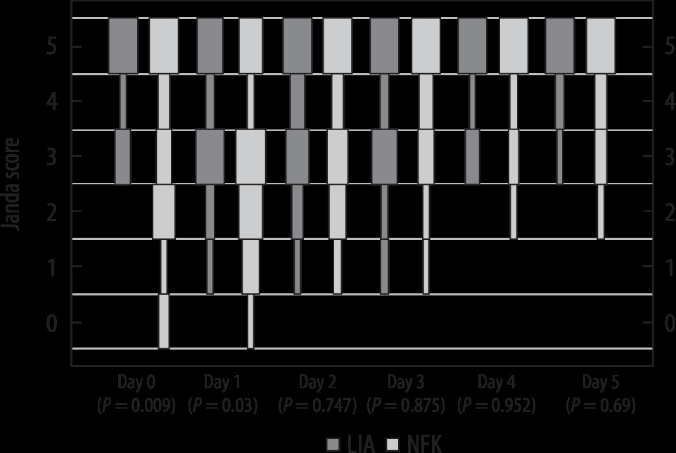 Quadriceps muscle strength, using the standardised Janda score, was significantly lower in the FNB group on day 0 (3.05 ± 1.67 vs. 4.35 ± 0.91; P = 0.009) and 1 (2.71 ± 1.57 vs. 3.67 ± 1.18; P = 0.030) but not on the following days (Figure 5).