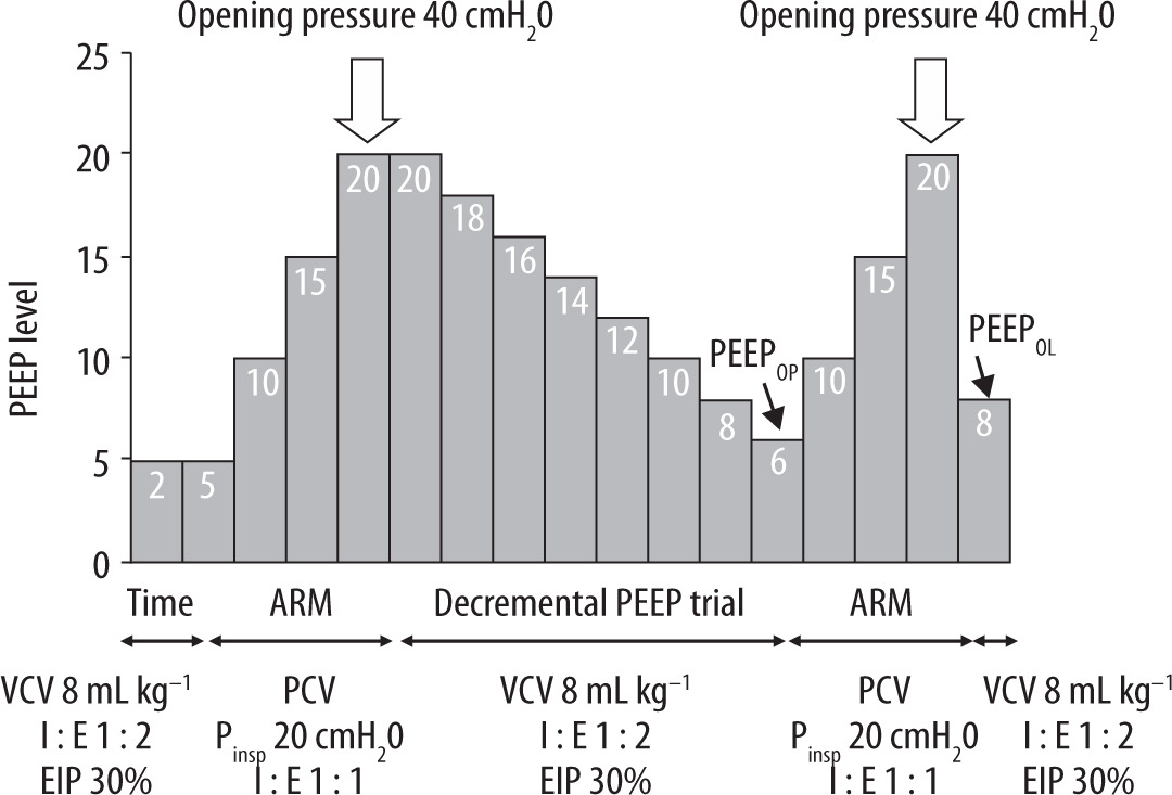 ARM – alveolar recruitment manoeuvre, EIP – end-inspiratory pause, PCV – pressure-controlled ventilation, PEEP – positive end-expiratory pressure, PEEPOP – optimal PEEP, PEEPOL – open lung PEEP, Pinsp – inspiratory pressure, VCV – volume-controlled ventilation