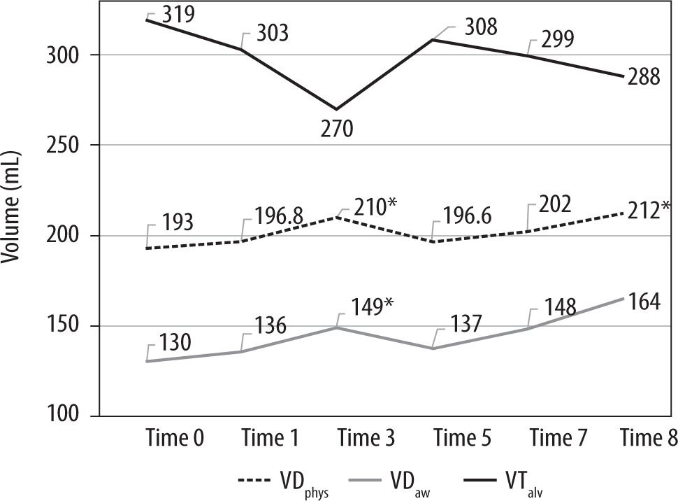 Dead volumes and VTalv modifications throughout the study period. Volume measurements are expressed in ml. *P < 0.05 in paired comparisons using Bonferroni correction for multiple comparisons