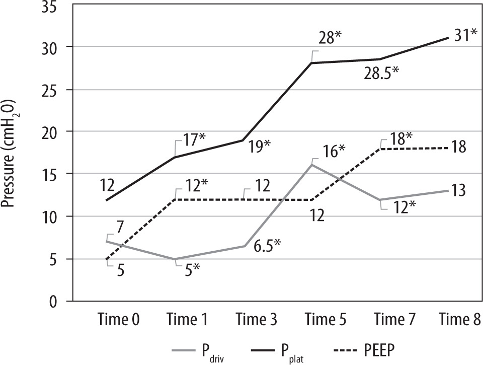 Respiratory mechanics throughout the study period. Airway pressure measurements are expressed in cm H2O. *P < 0.05 in paired comparisons using Bonferroni correction for multiple comparisons