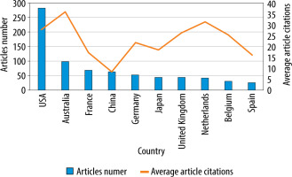 The USA research centres published most frequently in collaboration with other foreign centres (265 publications), among other countries. In second and third place were Australia and France, with 198 and 117 articles, respectively. The most extensive collaboration between the two countries was between the USA and Australia; they published 49 manuscripts in cooperation. This was followed by the Australian-French and USA-German collaborations, with 29 and 21 publications, respectively. A graphical representation of the observed partnerships is shown in Figure 4.