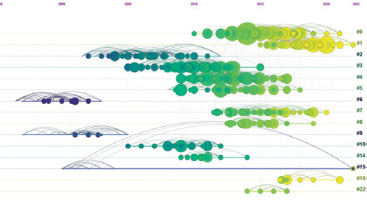 We used Bibliometrix [15] and Microsoft 365 Excel to analyse and report: publication frequencies, country, organisation, journal, and author data, h-index, citations, and authors’ keyword occurrence. The country was attributed according to correspondence author affiliation. We used authors’ keywords, originally provided with the manuscript, to eliminate bias related to their automatic assignment by the WoS database. VOSviewer [17] allowed us to assess and visualise keyword co-occurrence (54 of the 1,410 keywords met the threshold set as at least ten keyword occurrences). In turn, we analysed reference co-citations using CiteSpace [16]. Using a scale factor equal to 25 and a timeframe from January 2000 to December 2022, the software qualified 870 records with a centrality of 925 nodes and 3,479 links.