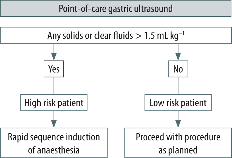 Conversely, the UK multidisciplinary consensus statement recommends continuing GLP-1RA therapy in the perioperative period, but states that it should be supported through risk assessment and stratification, shared decision-making and the use of peri-operative techniques to mitigate risk of pulmonary aspiration [18]. Performing preoperative point-of-care gastric ultrasound in patients who continue GLP-1RA therapy appears to be an appropriate strategy (Figure 2). This approach may help identify patients at increased risk of aspiration, preventing unnecessary surgical delays or cancellations, and enhance patient safety. Although not yet widely adopted, point-of-care gastric ultrasound is likely to become more integral to perioperative management. Some authors suggest that it might have limited application due to its variability [31]. Studies have shown that performing 33 supervised gastric ultrasound examinations is required to achieve a 95% accuracy rate in qualitative assessment of gastric content [32]. Furthermore, this method might be technically challenging in patients with obesity. For patients identified as high risk on the day of the procedure, rapid sequence induction (RSI) of general anaesthesia may be considered, or regional anaesthesia may be used if feasible [17].