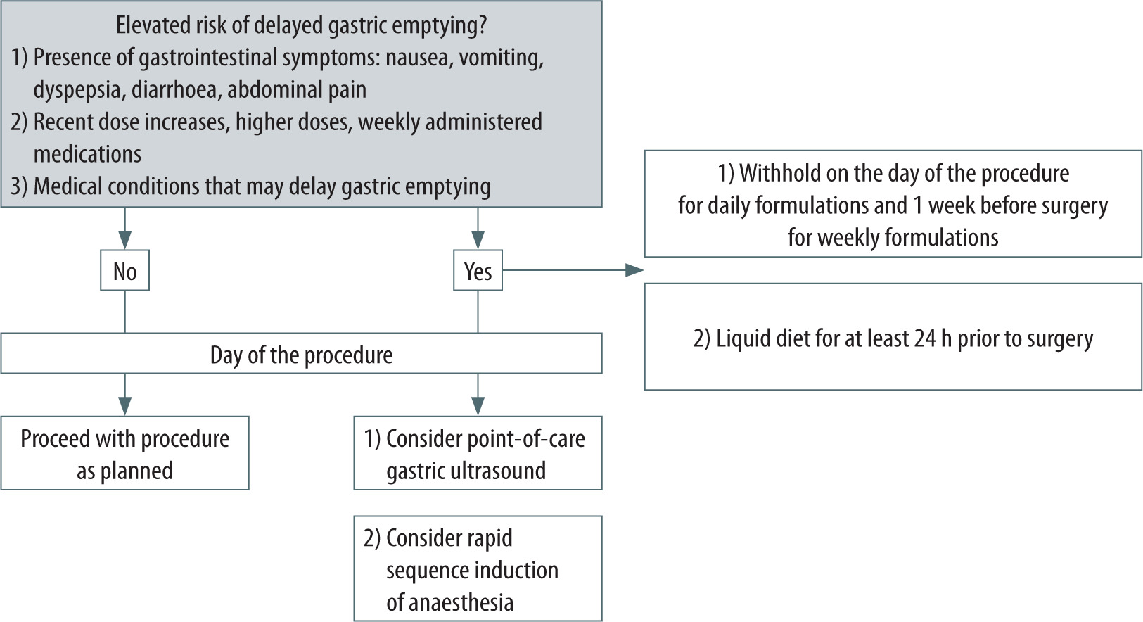 The perioperative management of GLP-1RAs has been addressed by several societies, highlighting the potential risk of RGC and pulmonary aspiration. In 2024 a consensus-based guidance was formed by representatives from the American Society of Anesthesiologists (ASA), the American Gastrointestinal Association (AGA), the American Society of Metabolic and Bariatric Surgery (ASMBS), the International Society of Perioperative Care of Patients with Obesity (ISPCOP) and the Society of American Gastrointestinal and Endoscopic Surgeons (SAGES) [17]. The guidance emphasises that decisions regarding the continuation or withholding of GLP-1RAs in the perioperative period should be based on shared decision-making involving the patient, anaesthesiologist, prescribing clinician, and surgical team. Therefore, the individual patient profile and the assessment of other possible risk factors for delayed gastric emptying are particularly important. The initial step is preoperative evaluation of aspiration risk, considering factors that may predispose to delayed gastric emptying. These include the escalation phase of dosing, long-acting GLP-1RAs, higher doses, and the presence of gastrointestinal symptoms of delayed gastric emptying (e.g., nausea, vomiting and abdominal discomfort). It is crucial to recognise that both diabetes and obesity can independently affect gastric motility. Moreover, concomitantly prescribed opioids, anticholinergics and tricyclic antidepressants can delay gastric emptying. According to the consensus, patients without identifiable risk factors may continue GLP-1RA therapy during the perioperative period. However, for individuals considered at higher risk of aspiration, a liquid diet is recommended for at least 24 hours before surgery. If a decision is made to temporarily discontinue GLP-1RA therapy, the duration of cessation should follow the guidance of the ASA: on the day of the procedure for daily formulations, and one week prior to surgery for weekly formulations [17]. It is important to note that discontinuing GLP-1RAs in patients with T2DM may increase the risk of perioperative hyperglycaemia, which has been associated with higher incidence of postoperative complications such as wound infection, delayed wound healing and prolonged hospital stay [30].
