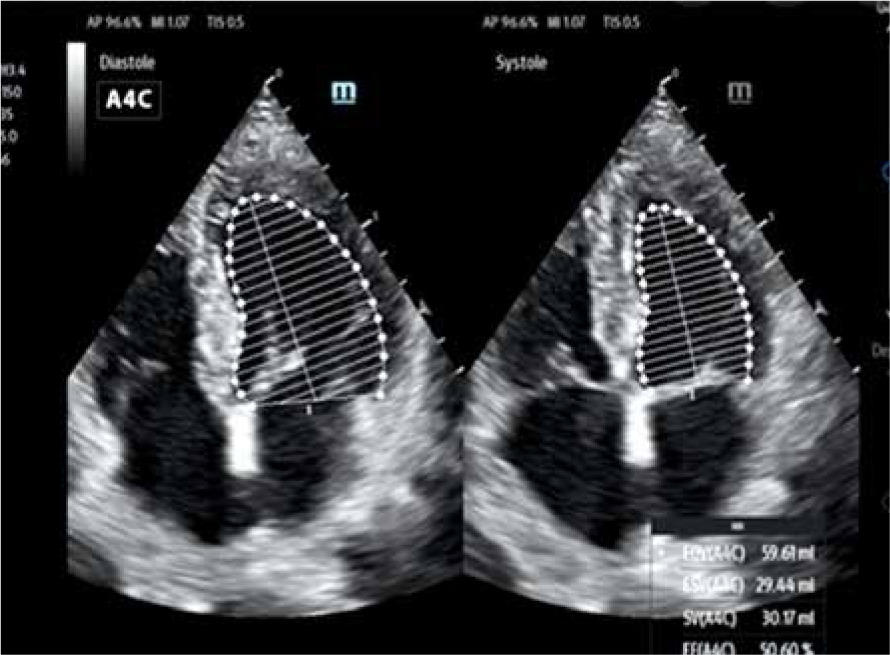 – AutoEF (Mindray/GE) is the system for automatic measurement of the left ventricular ejection fraction (LVEF), one of the most important parameters for the evaluation of cardiac efficiency. Similarly to SmartVTI, the measurement is fully automatic. This time, however, the only task of the operator is to obtain proper apical, 4-chamber or 2-chamber projection and then to click on the AutoEF icon to launch automatic measurement of the ejection fraction (EF). Following this, the system automatically outlines the systolic and diastolic left ventricle in real time. Making use of Simpson’s method (biplane disk summation), the system presents measurement of the end-diastolic volume (EDV) and EF. This ensures the objective character of the EF evaluation made by the operator [8]. The usefulness of such methods depends on the sonoanatomic condition of the patient (Figure 4).