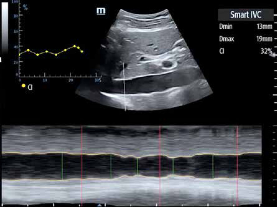 – SmartIVC (Mindray) or AUTO IVC (GE) provides automatic measurement of the inferior vena cava, which helps to estimate susceptibility to fluid therapy. A condition to obtain a trend graph documenting changes in the collapsibility index and the diameter index (DI) is projection of the inferior vena cava along the long axis on the level of the xiphoid process. As soon as an image like that presented in Figure 5 is obtained, along with the fragment of the right atrial orifice, it is possible to click on the SmartIVC icon to start the automatic measurement. The system will automatically present collapsibility index and DI values in real time along with the quotient of the 2 parameters expressed as the collapsibility percentage.