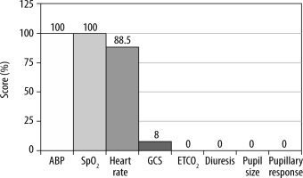 According to the Guidelines from the Association of Anaesthetists and the Neuro Anaesthesia and Critical Care Society, during the transfer it is important to monitor and document the following aspects: Glasgow Coma Scale, pupil size and response to light, standard ECG, arterial blood pressure, SpO2, and diuresis and ETCO2 if a patient is intubated or being ventilated. Unfortunately, in 21.8% of all transported neurocritical patients’ cases, the transport sheet was not completed at all. After analysing the filling protocols of 61 patients during transportation to the Hospital of Lithuanian University of Health Sciences Kaunas Clinics Neurosurgery unit, it was found that although diuresis and ETCO2 were not monitored in any patient, the vital parameters were monitored better than the neurological status of the patients. Consciousness was assessed by GCS in only 8% of patients. Pupil size and reaction to light were not assessed in any patient (Figure 2).
