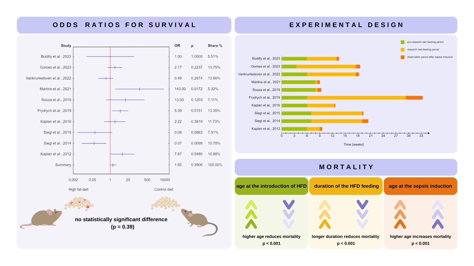 The impact of obesity on outcomes in preclinical animal models of sepsis has already been the subject of comprehensive reviews, with detailed analyses provided by Xu et al. [44], and Eng et al. [9]. Xu et al. [44], in a systematic review and meta-analysis published in 2020, evaluated 21 studies comparing survival in obese versus non-obese animals (mice or rats) following exposure to bacteria, lipopolysaccharide, or influenza virus. The studies included in the comparison utilized various models of sepsis, infection, and obesity. Their analysis demonstrated that obesity consistently reduced survival in both single-strain bacteria- and lipopolysaccharide-exposed studies, not significantly in CLP models, and significantly in influenza models, albeit with high heterogeneity. Eng et al. [9], in a scoping review published in 2024, provided critical insights by analyzing the diversity of diet-induced sepsisobesity murine models, focusing on differences in sepsis induction (such as variable induction protocols, needle gauge, number of punctures), fluid resuscitation, antibiotic therapy, and analgesic administration, as well as variations in obesity models, particularly concerning the composition of HFDs [9]. These reviews have significantly advanced the understanding of the complexities of modelling sepsis and obesity in preclinical settings. To date, this paper is the first meta-analysis to assess the impact of time points and specific interventions, such as the age at the start of HFD, the duration of HFD, and the age at the time of sepsis induction, on survival in the CLP-DIO (sepsis-obesity) model.