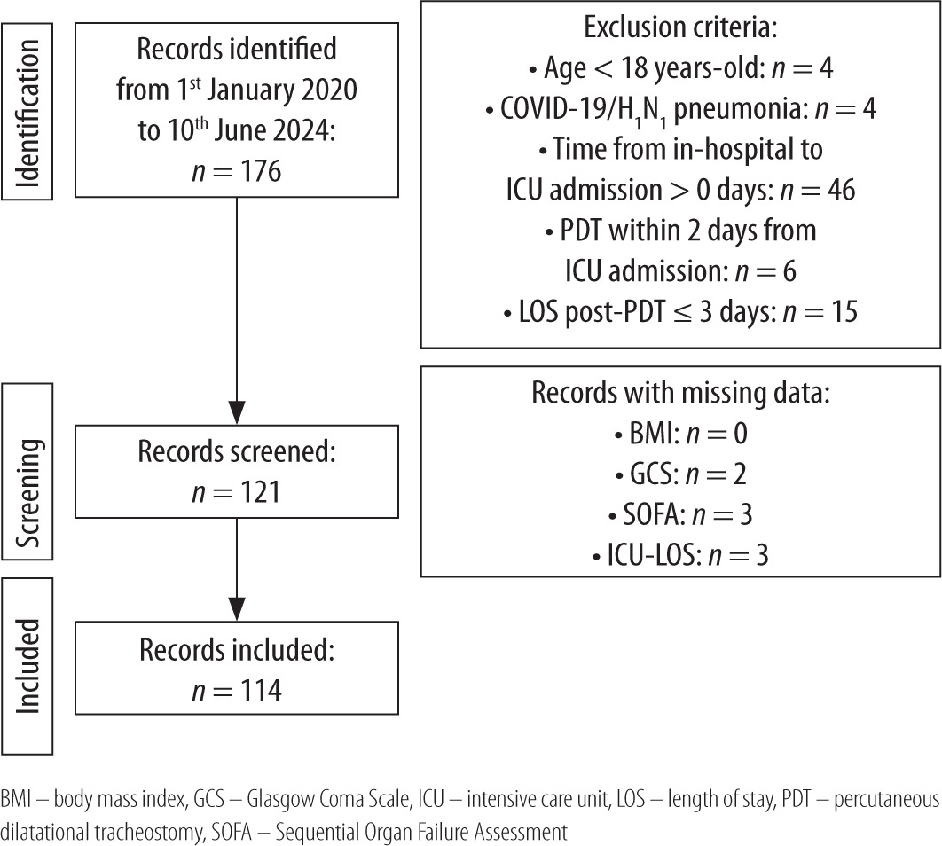 Exclusion criteria were: age < 18 years old, COVID-19 and H1N1 influenza, time from in-hospital to ICU admission > 0 days, PDT performed within 2 days from ICU admission, and post-PDT LOS in ICU ≤ 3 days. Then, we evaluated missing data (MD). MD were considered as missing completely at random, and observations were deleted.