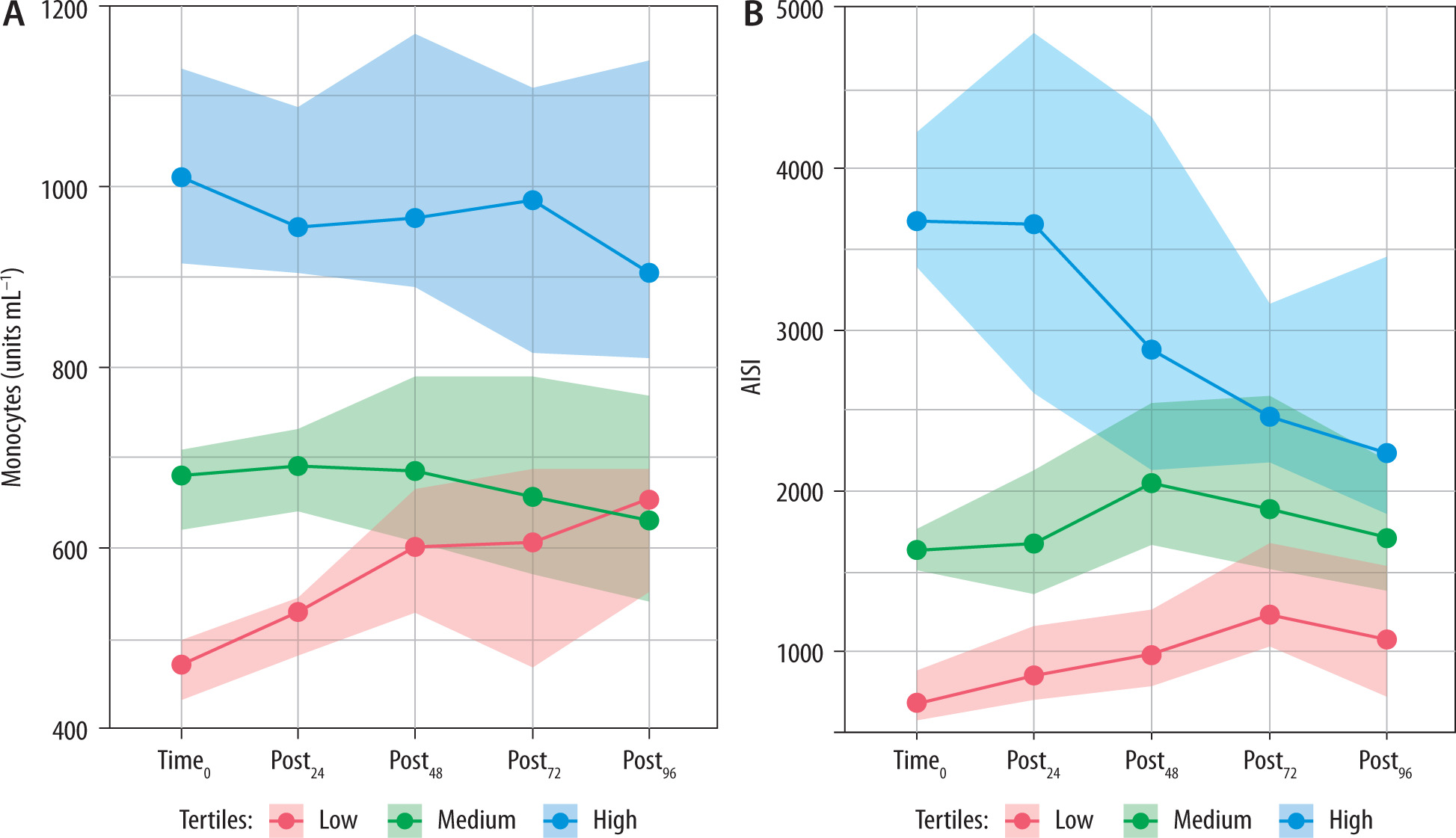 Tertile trend lines with median values for monocytes (A) and Aggregate Index of Systemic Inflammation (AISI) (B) over time. Dots represent median values, while shaded areas indicate the 95% confidence interval (95% CI)