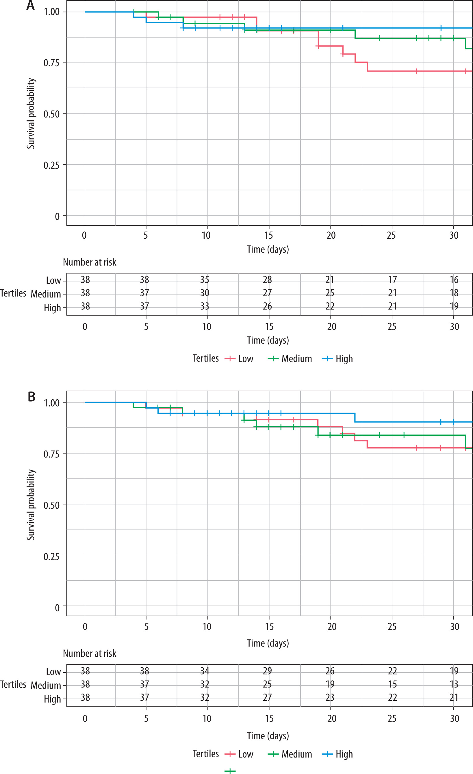 Supplementary File 1 (Section 3.2) provides a detailed description of the results. Only monocytes and AISI showed significant tertile–time interactions associated with outcomes (Table 3). For monocytes (Figure 2A), post-hoc analysis with the Friedman test showed that only trends in the Low tertile (χ2 = 32.600, df = 4, P < 0.001) were statistically significant. The pairwise analysis reported a statistically significant difference from Time0 for all consecutive times (paired W test P < 0.001), suggesting a constant increase over time. Mortality rates were higher in the Low group (36.8%, 14 patients), but not statistically significantly (χ2 = 5.534, P = 0.063). In the univariate logistic regression analysis, patients in the High tertile showed a reduced death probability compared to Low tertiles (OR: 0.321, 95% CI: 0.302-0.925, P = 0.042). In the multivariate model, Medium (OR: 0.323, 95% CI: 0.101–0.937, P = 0.044) and High (OR: 0.287, 95% CI: 0.087–0.847, P = 0.029) tertiles showed a reduced death probability compared to the Low tertile. The 30-day survival probabilities were 71.0% (95% CI: 55.6–90.6%) for Low, 87.1% (95% CI: 76.0–99.9%) for Medium, and 92.1% (95% CI: 83.9–100.0%) for High. The median survival times could not be determined for any group, as less than 50% of patients experienced the event within the study period. The log-rank test indicated no significant difference in survival curves among tertiles (χ2 = 5.600, df = 2, P = 0.061, Figure 3A). For AISI (Figure 2B), post-hoc analysis with the Friedman test showed that trends in Low (χ2 = 22.600, df = 4, P < 0.001), Medium (χ2 = 11.900, df = 4, P = 0.018), and High (c 2 = 20.700, df = 4, P < 0.001) tertiles were statistically significant. The Low tertile had a consistent increase, with significant pairwise changes (paired W test P < 0.05). In the Medium tertile, only the difference between Time0 and Post48 was significant (paired W test P = 0.006). In the High tertile, a significant difference was observed only between Time0 and Post72 (paired W test P = 0.042). Death rates in tertiles were 31.6% (12 patients) in the Low, 26.3% (10 patients) in the Medium, and 13.1% (5 patients) in the High tertile. However, mortality rates were not statistically significant (χ2 = 3.785, P = 0.151). In the multivariate logistic regression analysis, High tertile (OR 0.270, 95% CI: 0.074–0.861, P = 0.034) was related to the outcome, but not in the univariate analysis (OR 0.328, 95% CI: 0.094–1.005, P = 0.060). The 30-day survival probabilities were 77.7% (95% CI: 64.3–93.7%) for the Low, 83.9% (95% CI: 71.7–98.2%) for the Medium, and 90.5% (95% CI: 80.5–100.0%) for the High tertile. The median survival times could not be determined for any group, as less than 50% of patients experienced the event within the study period. The log-rank test indicated no significant difference in survival curves among tertiles (χ2 = 3.000, df = 2, P = 0.200, Figure 3B).