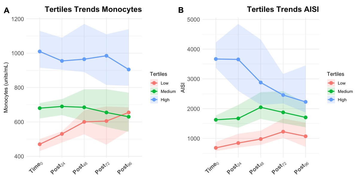114 patients who underwent PDT were included. ART demonstrated significant interactions with monocytes and the Aggregate Index of Systemic Inflammation (AISI) relating to outcomes. Monocytes in the Low tertile significantly increased over time (P < 0.001). In multivariate analysis, patients in the Medium (OR: 0.323, 95% CI: 0.101–0.937, P = 0.044) and High (OR: 0.287, 95% CI: 0.087–0.847, P = 0.029) tertiles had a lower probability of death compared with the Low tertile. AISI trends in the Low, Medium, and High tertiles were significant (all P < 0.05). The Low tertile consistently increased over time (all pairwise P < 0.05). Multivariate regression indicated that high AISI was associated with outcomes (OR: 0.270, 95% CI: 0.074–0.861, P = 0.034). Log-rank tests for survival were not significant for monocytes or AISI.