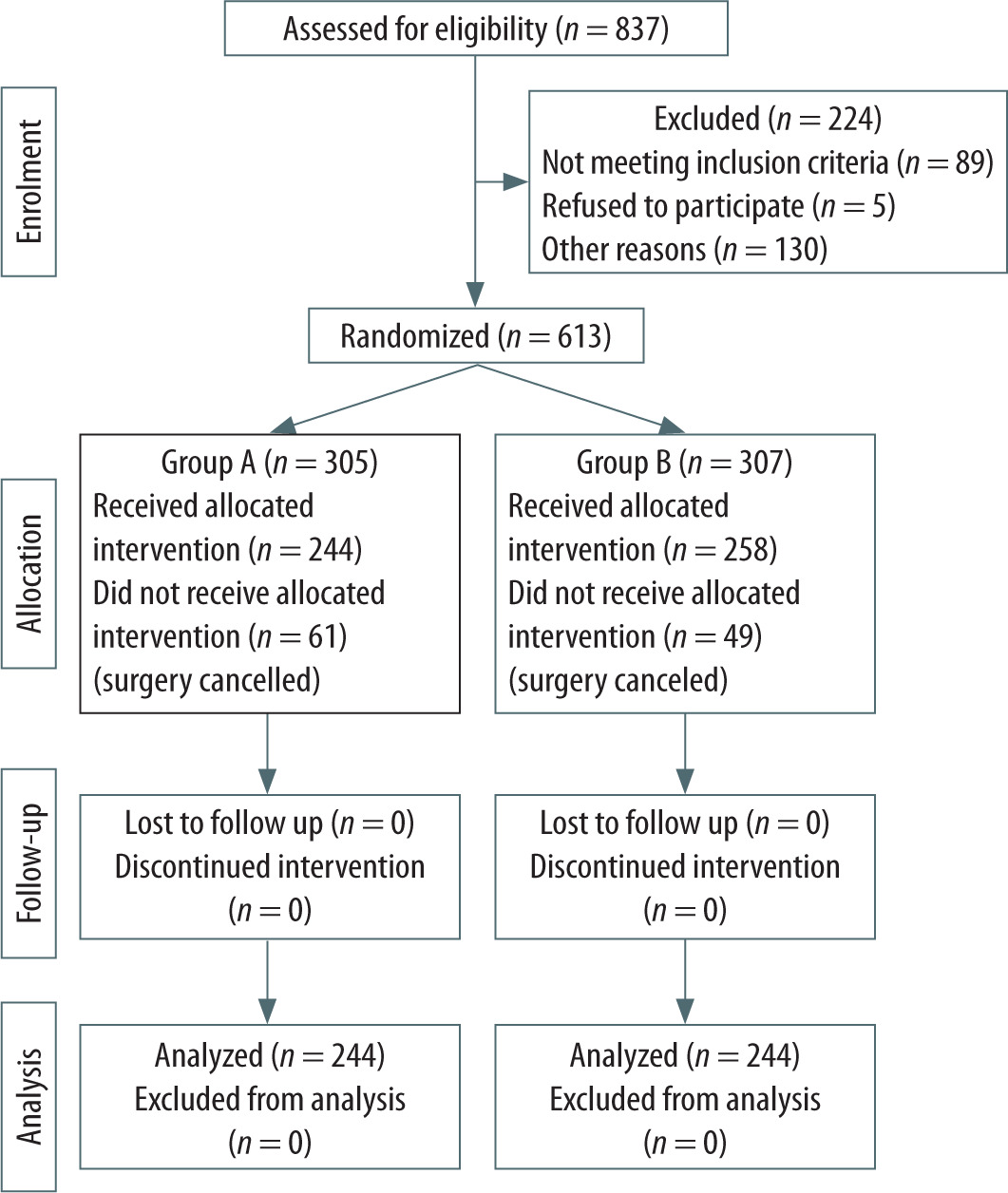 A total of 837 patients were assessed for eligibil- ity. A total of 613 subjects were randomized to two groups equally. There were 61 patients in Group A and 49 patients in Group B who did not receive the allocated intervention because of surgery cance- lation due to the COVID-19 pandemic outbreak. See Figure 1 for a diagram of the enrolment process.