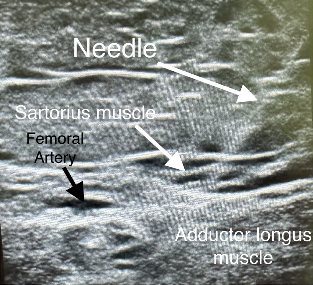 The transducer was placed in a transverse orientation at the middle level of the middle third of the thigh. The femoral artery, sartorius, adductor longus, and vastus medialis muscle were identified. The limits of the femoral triangle and adductor canal were determined by scanning up and down until the medial border of the sartorius muscle meets the medial border of the adductor longus. The scanning distally continued until the adductor longus muscle became shorter in the ultrasound image, and the artery was located in the middle of the sartorius muscle. The needle was inserted in-plane in a lateral to medial direction and advanced towards the femoral artery and saphenous nerve. To reduce the risk of intravascular injection or hematoma, we identified the position of the femoral vein by applying and releasing the transducer pressure as it opens and closes the femoral vein. After the negative aspiration, 1 mL of local anesthetic was injected to confirm the proper injection site. A total of 10 mL of 0.5% ropivacaine was administered.