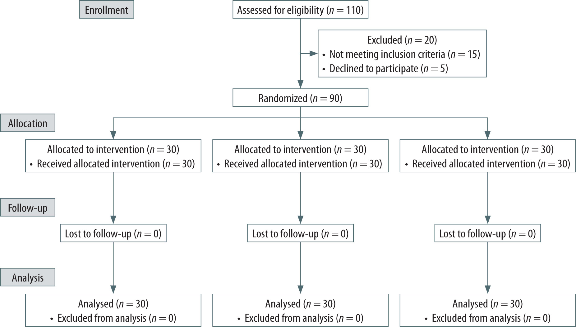 Of the 110 patients assessed for eligibility, 15 did not meet the inclusion criteria, and 5 refused to participate. The remaining ninety were randomly allocated to three groups and analyzed, as seen in Figure 4. No subjects were lost to follow-up. No clinically relevant differences were apparent from group characteristics, as shown in Table 1.
