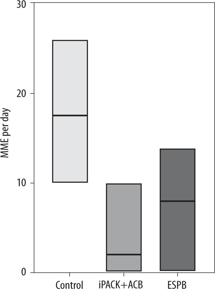 The total opioid consumption within 48 hours after surgery, expressed in milliequivalents of intravenous morphine, was accessed at the orthopedic wards by the residents and fellows, who were blinded to the study.