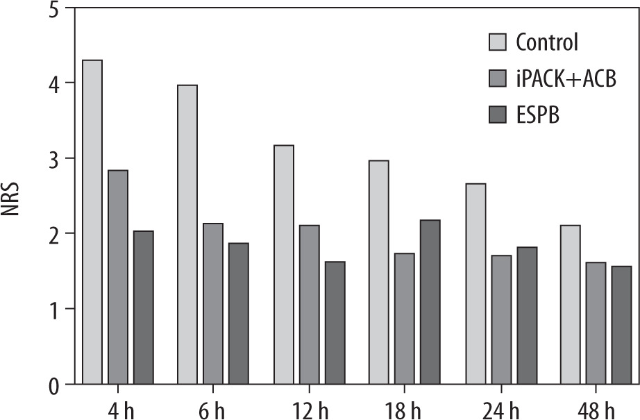The iPACK+ACB and L-ESPB group patients had lower NRS scores at all time points (4, 8, 12, 16, 20, and 24 hours after surgery) than the control group. The NRS scores 4 hours after the surgery were lower in the L-ESPB group compared to the iPACK+ACB group. The NRS scores did not differ between the iPACK+ACB and the L-ESPB groups at the remaining time points (8, 12, 16, 20, and 24 hours after surgery), as seen in Figure 6.
